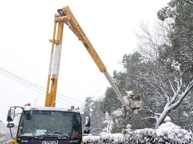 当天,当地下起了大雪,为确保大雪天气下居民可靠用电,该公司积极运用无人机对辖区线路及用电设备开展红外测温和全量巡视,检查发现10千伏工业平台I线46号杆因线路积雪过重,C相导线断股,有断线风险,需立即处理。当天下午,室外温度低至-2摄氏度。该公司带电作业班来到施工现场进行带电作业支援,工作人员穿戴绝缘服、绝缘手套,做好安全措施后,进入带电作业车斗内。随着绝缘斗臂车缓缓升起,在寒风中,工作人员稳定地操作着绝缘斗臂,一步一步调整斗臂位置,当斗臂停留在最适宜作业位置后,高空中的两人依次使用绝缘用具对高压线路进行包裹、隔离等操作。经过30分钟的高空带电作业,工作人员快速、准确地完成断股导线接续加强工作,整个施工过程“零感知”。