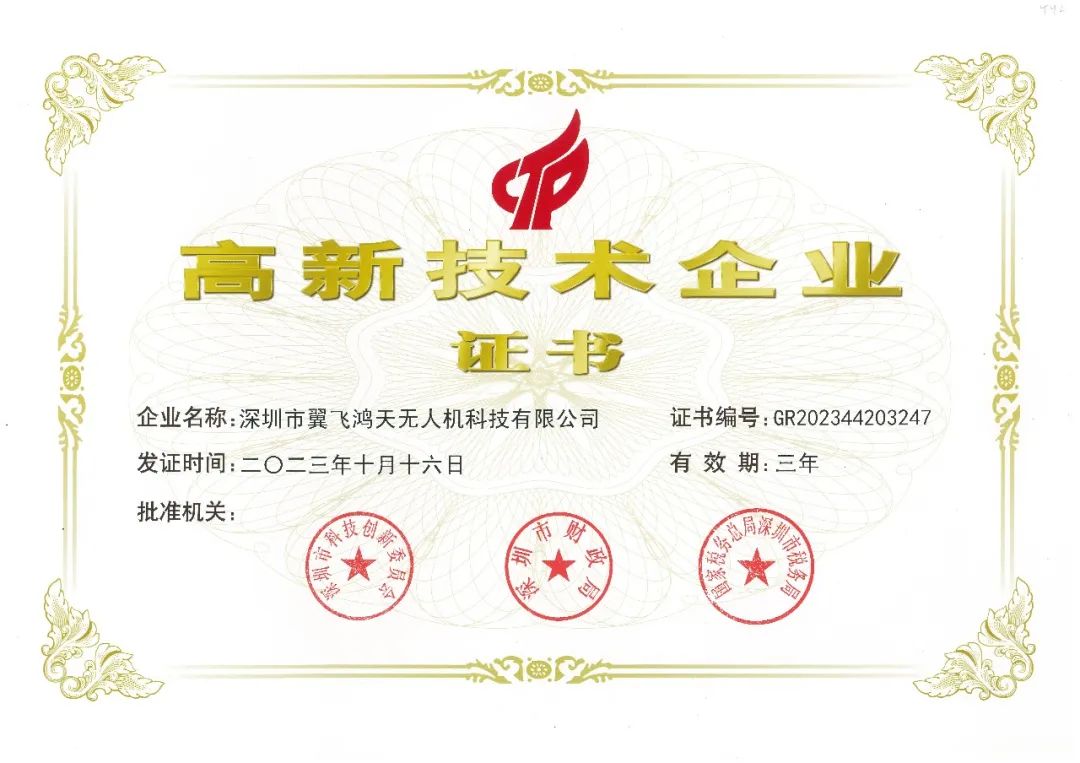 国家高新技术企业认定,是对企业技术实力、研发投入、创新能力、科技成果转化能力等方面的综合评价。此次认定,是对翼飞鸿天过去几年努力的肯定,也是对公司未来发展的鼓励。在低空经济腾飞的大背景下,翼飞鸿天将充分发挥高新技术企业的优势,紧密围绕国家发展战略,积极参与无人机产业的创新与发展,与行业伙伴携手共进,共创辉煌!