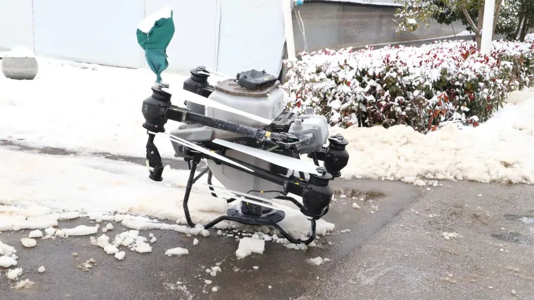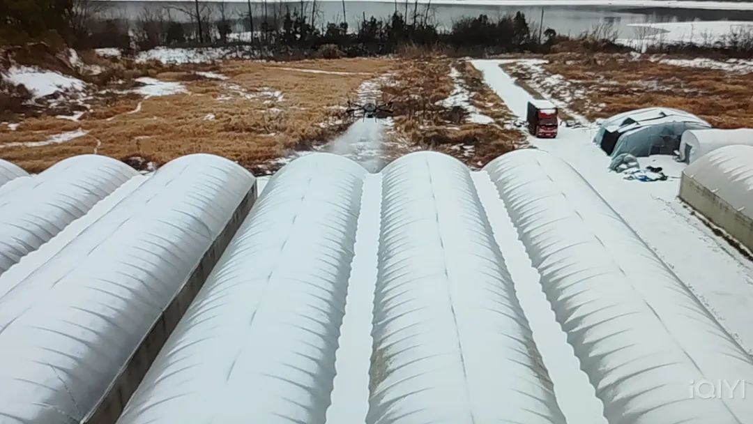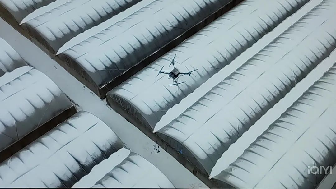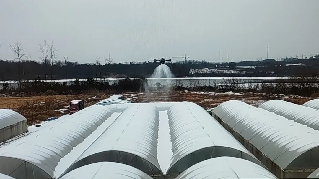 在江夏区五里界武汉菓然农业有限公司蔬菜大棚基地, 技术人员熟练操作无人机高空喷洒融雪剂进行除雪,原本一个标准化的蔬菜大棚需要两到三个小时才能完成顶棚清雪工作,无人机不到半个小时就清理完毕。