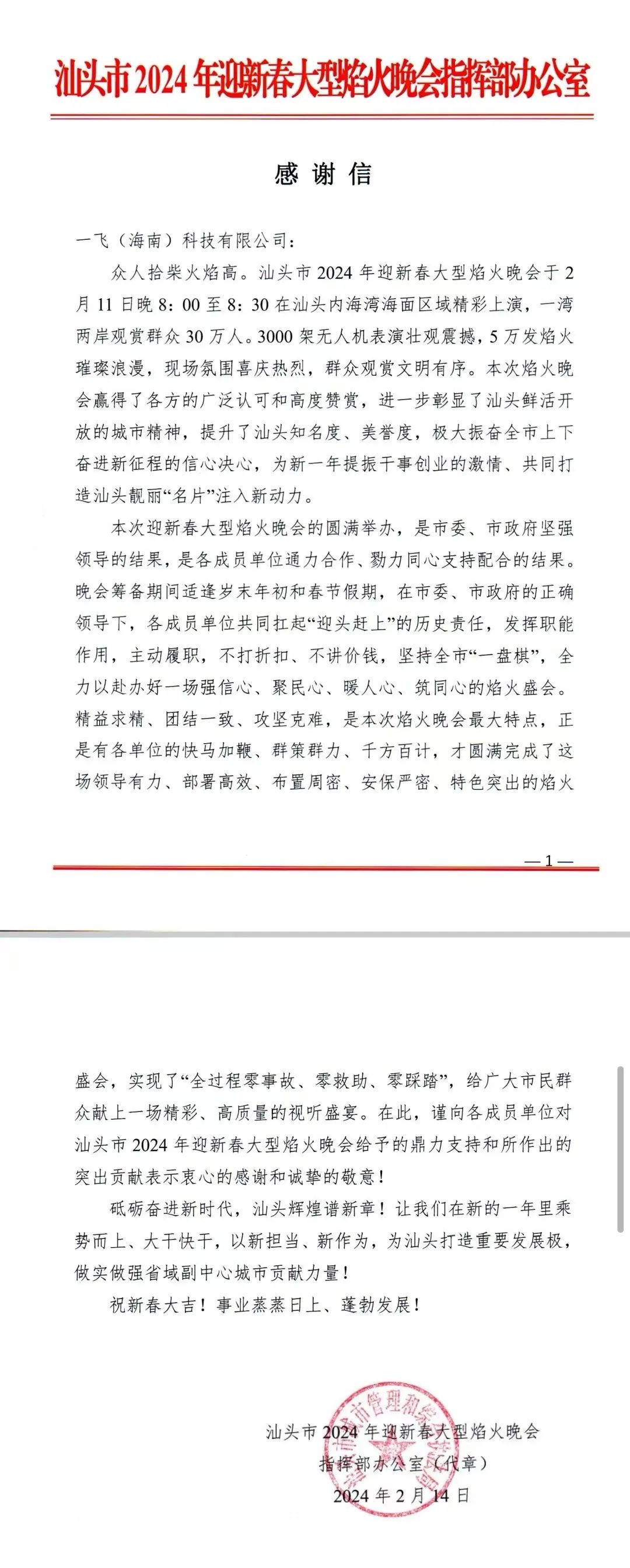 据不完全统计,春节与元宵节期间,一飞智控无人机编队执飞架次超过10,0000架次。在中央广播电视总台、人民日报、新华社等央级以及几十家省级媒体平台和境外媒体平台均有报道,线上线下累计曝光量约25亿+。