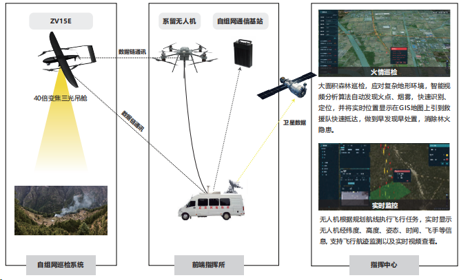 利用卓翼智能ZV-15E复合翼无人机对森林进行日常巡护,可显著提高了森林巡护工作的效率和质量。ZV-15E操作简单、扩展性好、一机多用,可通过多种通讯链路进行远程控制,火场高清视频实时回传;配合专业测绘载荷可对火情现场进行图像采集,快速建立火场正射、实景三维地图,辅助科学部署决策;6小时超长航时可对林区进行大规模高频次巡查,火情隐患及时发现。