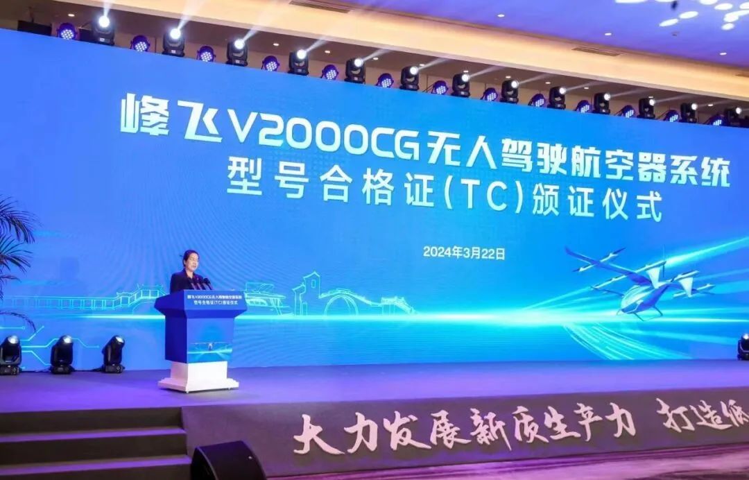 峰飞V2000CG无人驾驶航空器系统获得CAAC颁发的型号合格证(TC),成为全球首个获颁TC的吨级以上eVTOL航空器