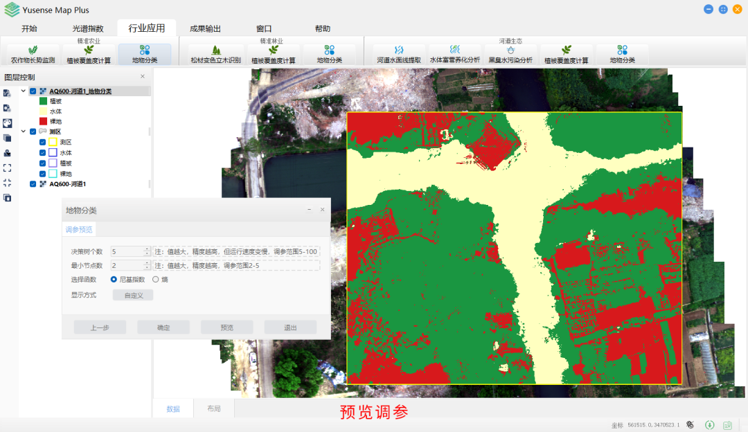 各行业应用模块新增地物分类功能,内置最大似然法与随机森林两种分类方法,满足用户在各领域对土地规划、种植规划与复杂地物面积统计等应用需求。