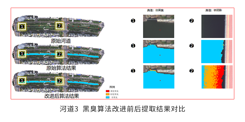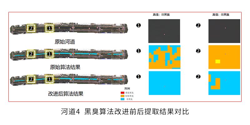 黑臭污染分析算法优化了算法架构方式,降低轻度浑浊水体对算法识别的影响,且基于《城市黑臭水体工作指南》进行黑臭分级。