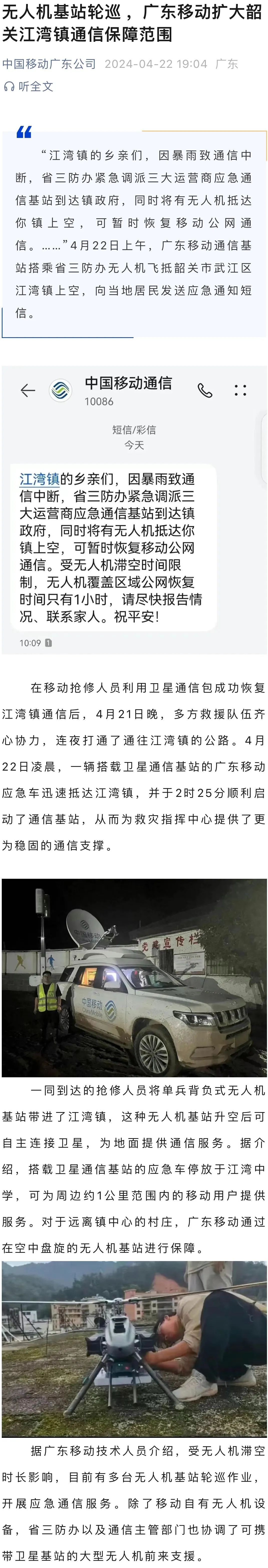 无人机基站为失联灾区提供公网应急通信服务!好消息持续传来!