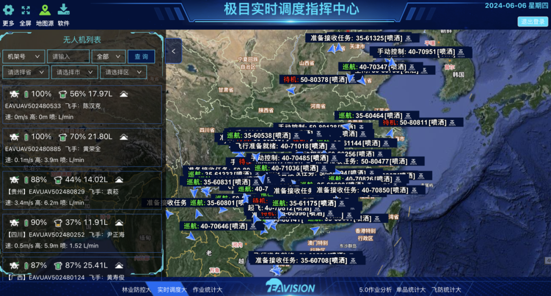 团队依托极目机器人数据大屏与智农管理系统,实现对无人机作业的全方位监控,包括喷洒面积、飞行时长及药液用量等关键数据的实时追踪。通过数字化云平台,同步监测飞手工作效率与作业统计情况,确保问题及时发现并纠正。数字化工具的使用既方便了团队管理作业,又极大提高了作业效率和质量。
