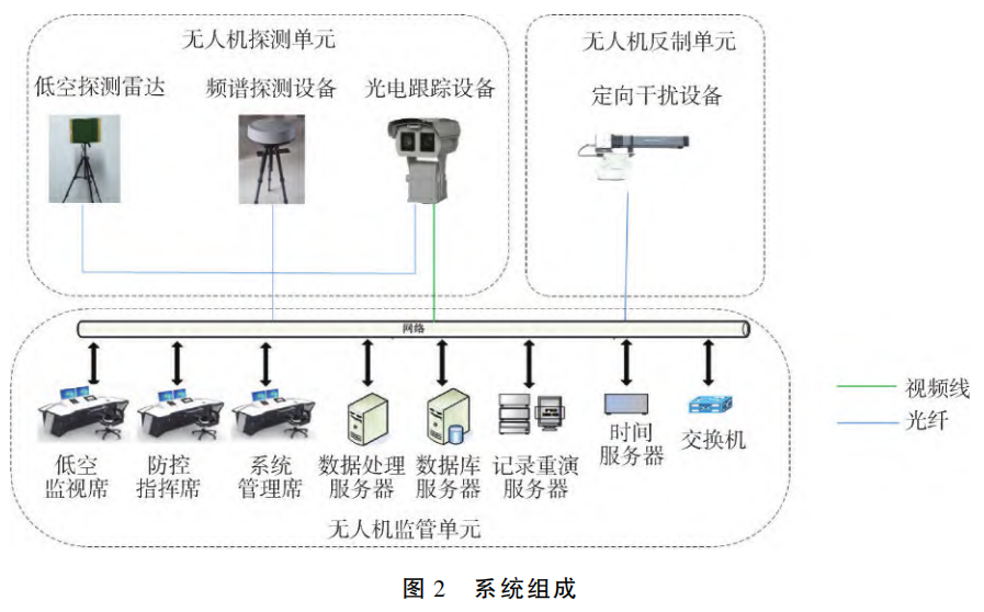 系统采用低空探测雷达、频谱探测设备、光电跟踪设备等多传感器融合技术,实现系统的探测识别跟踪,采用分布部署、集中管理的方式,可对各设备进行全局化的集中统一式监视和管理,将各集成设备的信息统一存储、显示和管理在同一指挥平台软件上,可准确、全面地反映各设备运行状态,提高突发事件的响应能力。各设备进行分散式控制,保持各设备的相对独立性,以分离故障、分散风险,便于管理。系统组成如图2所示。