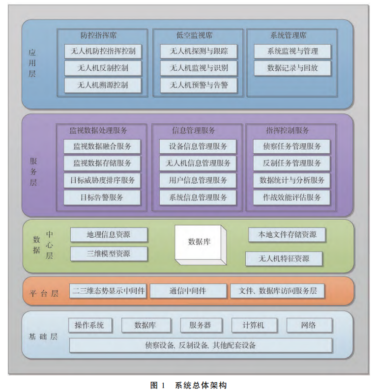 (5) 基础层。基础层为系统提供侦察设备、反制设备、无人机、无人机放飞回收设备和其他配套设备设施,以及软件运行的服务器、计算机、操作系统和网络等运行资源。
