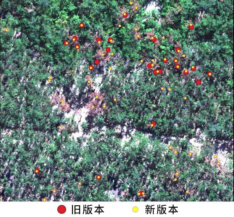 基于积累的松材变色立木正负样本优化算法结构,增强变色立木目标特征,降低裸土、阴影、林隙中林下复杂目标的干扰,从而减少误提;同时丰富图像学算法要素,降低“异物同谱”产生的漏提。