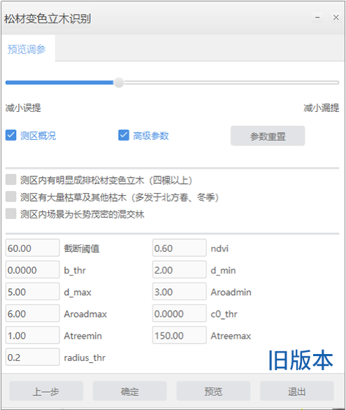 V1.4.0版本将林业模块下的松材变色立木识别模块的功能全新升级,包括算法架构和算法调参项功能,显著提升了变色立木提取准确率及适用场景,同时将调参选项减少,并增加了参数项的功能描述,提升用户自定义提取的应用体验。