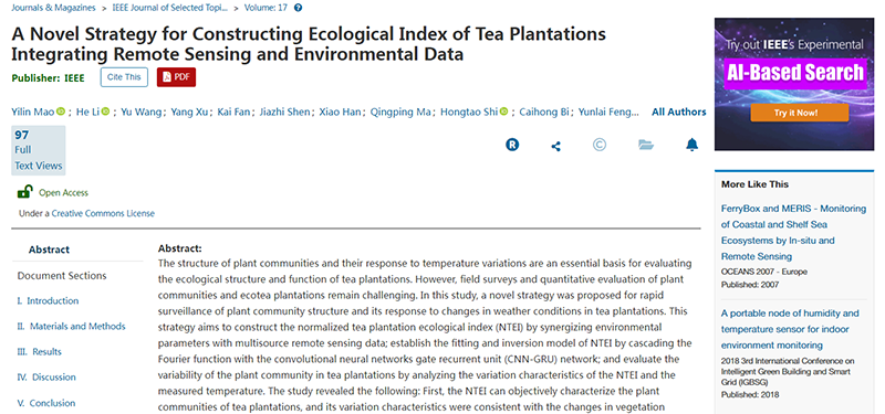 山东省农业科学院茶叶研究所丁兆堂团队,在《IEEE Journal of Selected Topics in Applied Earth Observations and Remote Sensing》发表了题为“A Novel Strategy for Constructing Ecological Index of Tea Plantations Integrating Remote Sensing and Environmental Data”的研究论文。