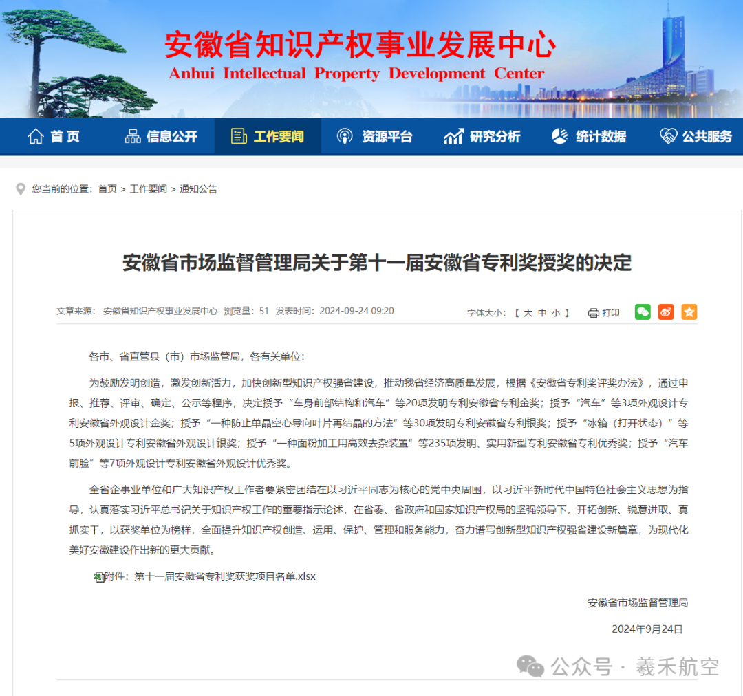 喜报丨羲禾航空荣获“安徽省专利优秀奖”!