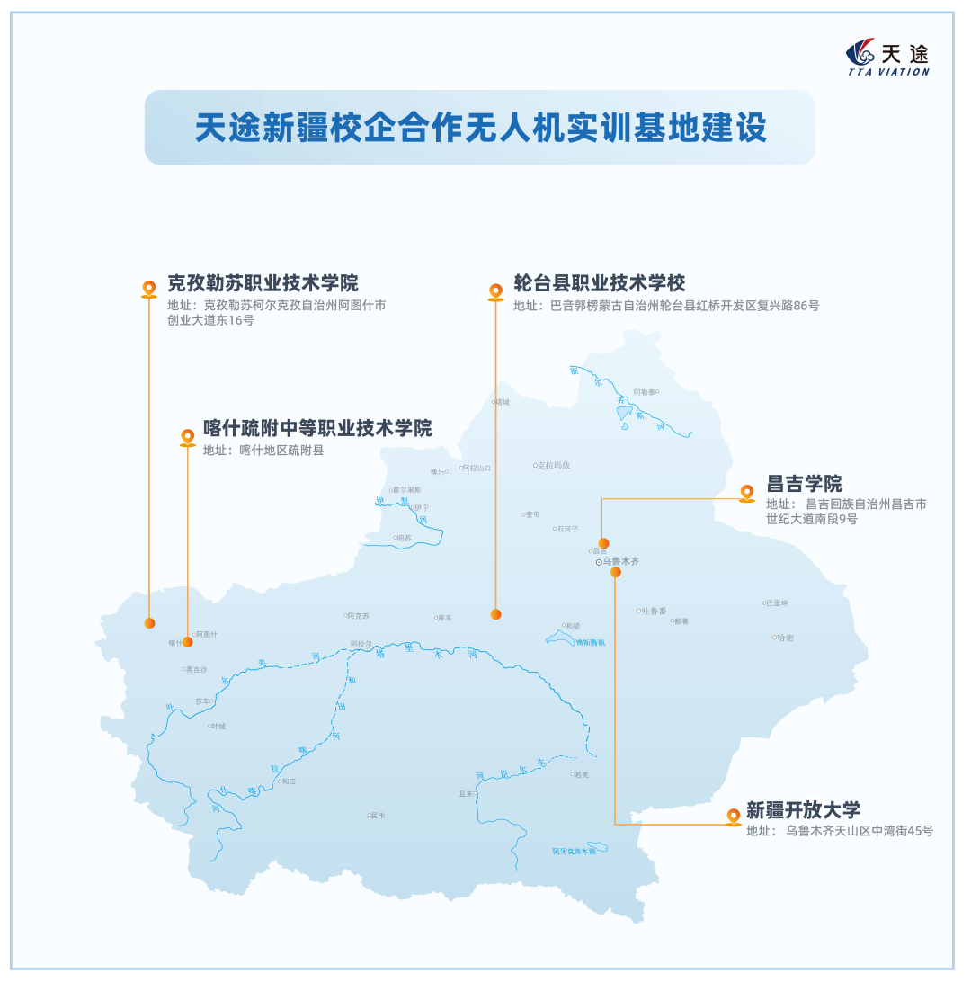 继新疆昌吉学院、新疆开放大学、克孜勒苏职业技术学院和轮台县职业技术学校之后,天途与喀什疏附县中等职业技术学校共建的无人机产教融合实训基地近日落地。