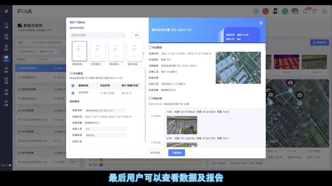 飞行任务完成后,用户可以在平台上查看完整的巡检数据和生成的报告。报告内容包括航线概览、巡检对象覆盖情况、图像与视频数据、识别到的异常事件等,支持多维度的数据分析和保存管理,便于后续分析和查询。