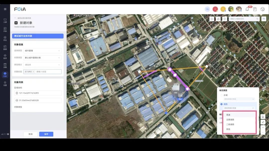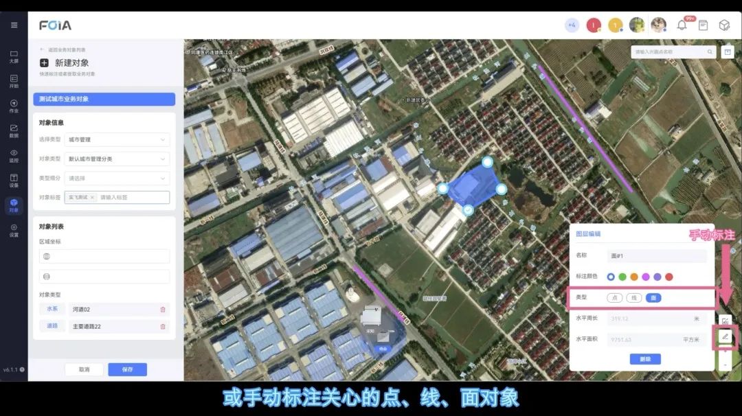 需要对地图自动提取以外的对象进行额外标注时,如事故高发地、特定水域的关键点、重点的建设区域或工业园区等,用户可通过手动标注标记特定的点、线、面等。这种灵活添加方式可以完成更个性化、更精细化的对象管理,实现更全面的覆盖。