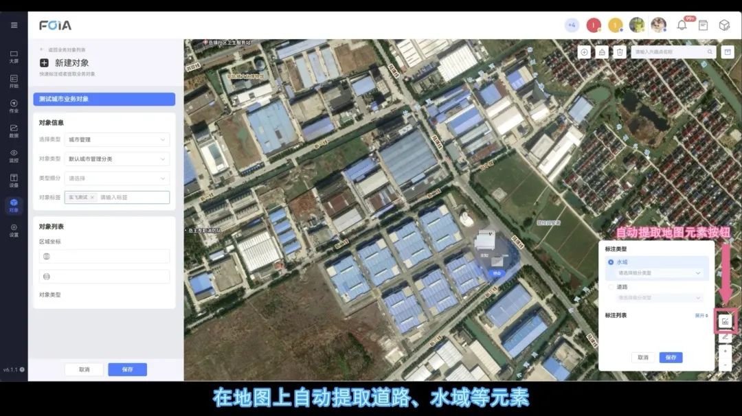 在这个“城市管理”的需求中,可能包含道路、水域、建筑、设施等需要巡视的对象。要找到这些目标,可以框选指定区域,系统会在地图上自动提取并标示出道路、水域等元素。
