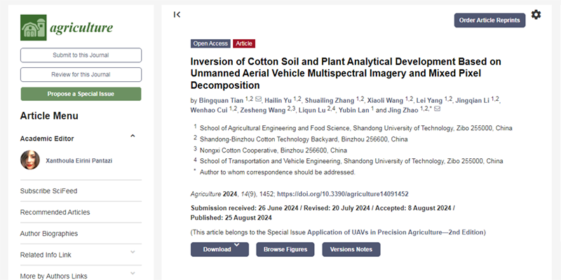 山东理工大学农业工程与食品科学学院兰玉彬团队在agriculture发表了题为“Inversion of Cotton Soil and Plant Analytical Development Based on Unmanned Aerial Vehicle Multispectral Imagery and Mixed Pixel Decomposition”的研究论文。