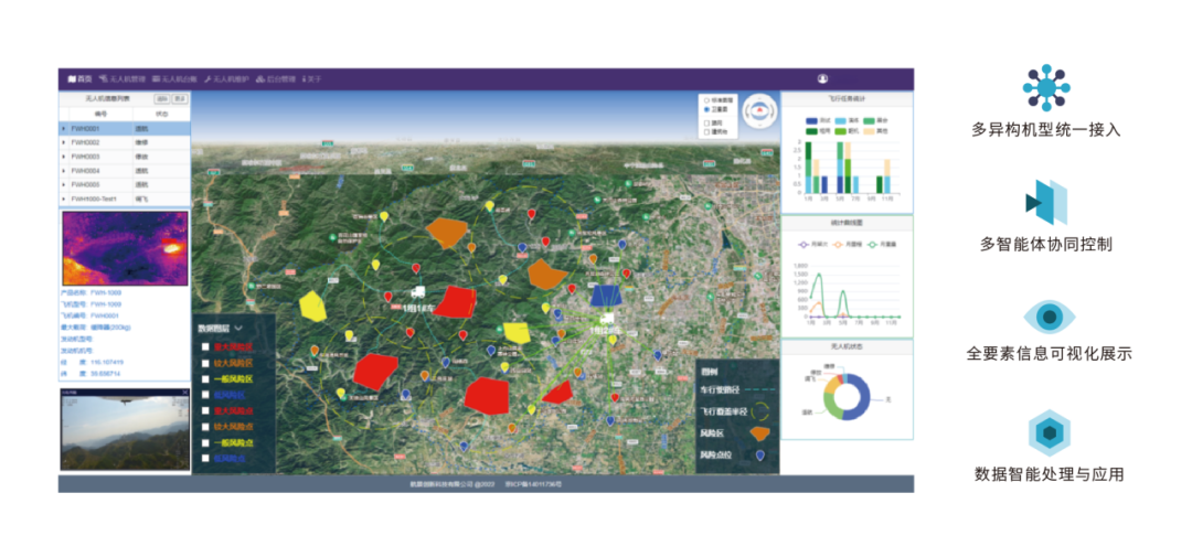 态势感知远程指挥平台融合了森林防灭火人员、无人机、地面装备、任务、数据等全要素信息的可视化展示,实现一张图的统管与调度,基于AI数据处理引擎,实现多异构机型的集中统一控制,开展多机高效协同任务,支持接入森林防火监控中心,为指挥联动与决策研判提供支持。