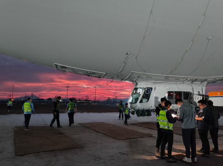 “祥云”AS700载人飞艇,诞生于被称为“中国之中”的湖北荆门。这款由中航工业特飞所自主研制的新型软式准平衡飞艇,拥有完全自主知识产权。以“一艇多型、系列发展”的设计理念,集绿色低碳、安全经济、舒适靓丽等特点于一体,航程可达700公里,最多可搭乘10人,能够广泛应用于“低空+旅游游览”“低空+运输物流”“低空+应急救援”等多个场景。