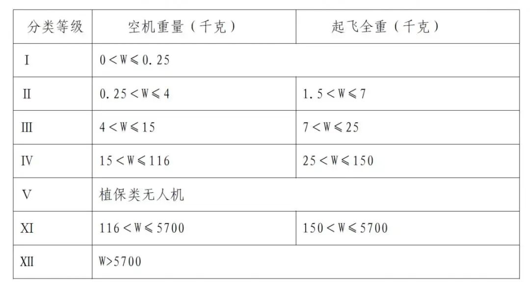 无人机根据空机重量和起飞全重可以被划分为7个等级。