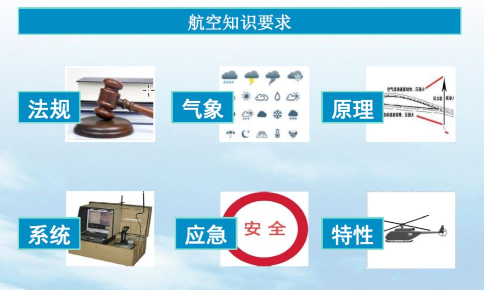 无人机法规、气象、飞行原理、无人机系统、应急安全、无人机特性。