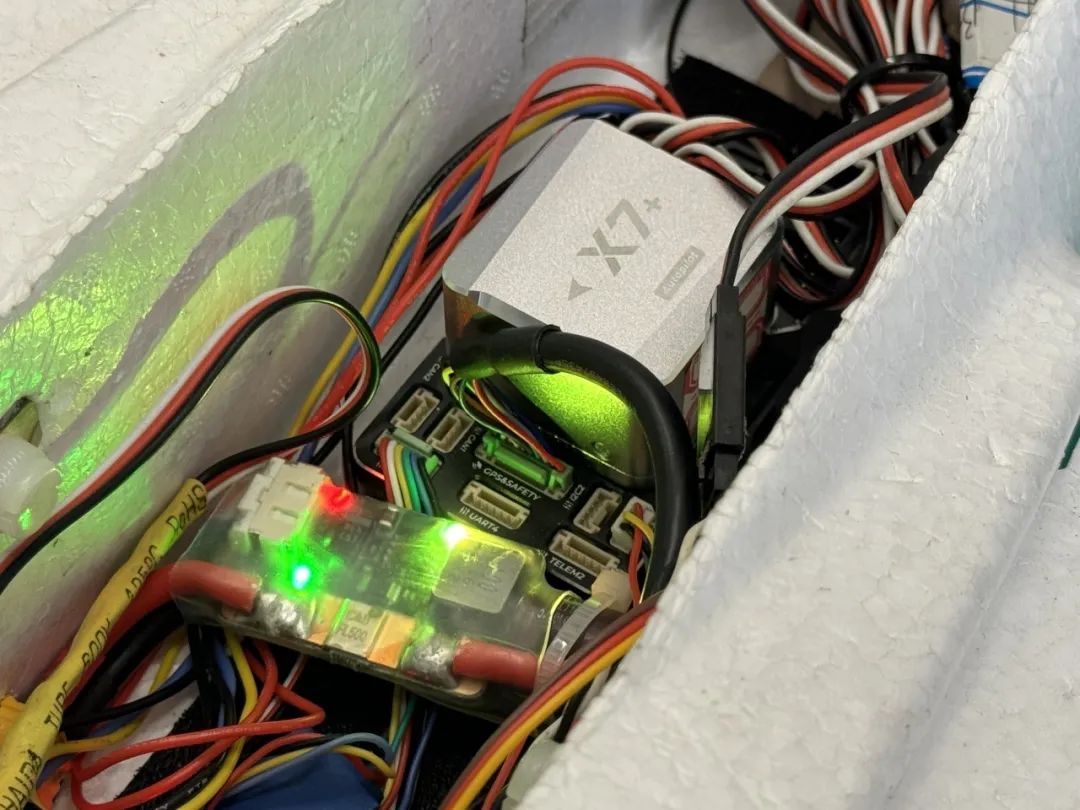 本次高校赞助,我们将X7+智能控制器搭载在一架用于靶标识别的固定翼飞机上承担自动飞行以及投水任务。