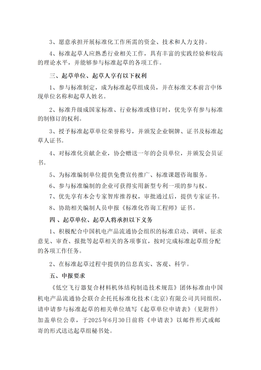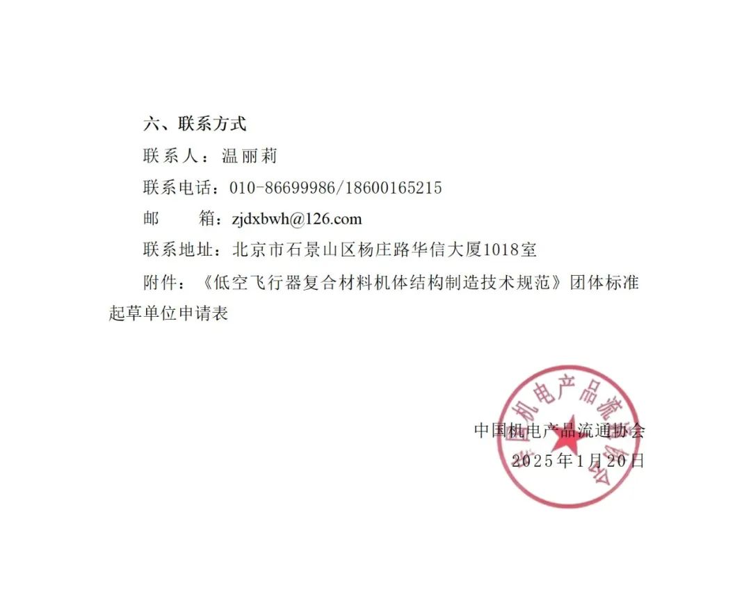 转载 2025-03-28 11:00 中机电 来源:中机电关于邀请参加《低空飞行器复合材料机体结构制造技术规范》团体标准起草单位的邀请函