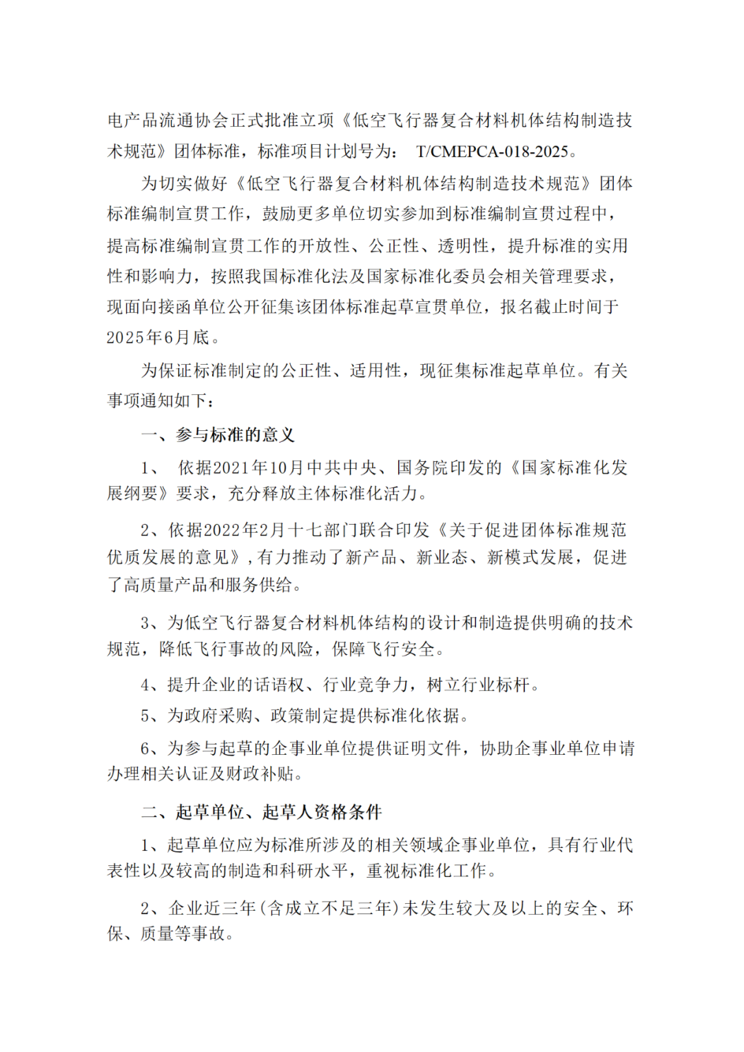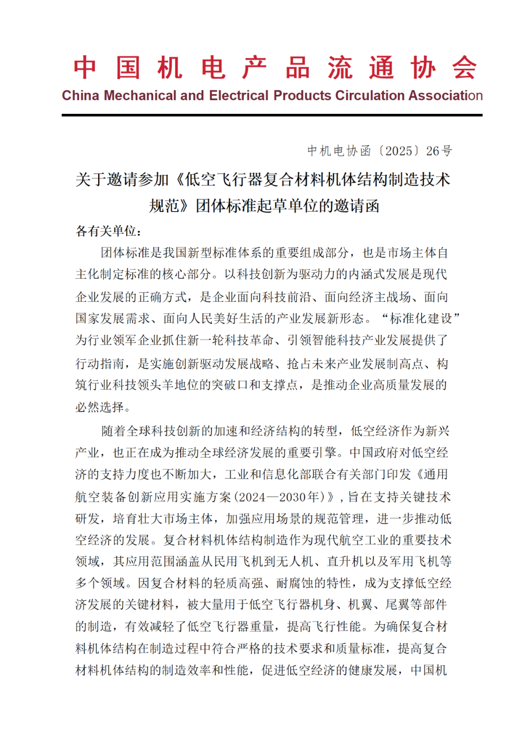 关于邀请参加《低空飞行器复合材料机体结构制造技术规范》团体标准起草单位的邀请函