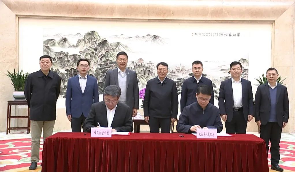 ▲ 合肥市委副书记、市长罗云峰,合肥市委常委、副市长袁飞,峰飞航空董事长兼CEO田瑜出席并见证签约。合肥市肥西县委副书记、县长王新华,峰飞航空高级副总裁谢嘉代表双方签约。