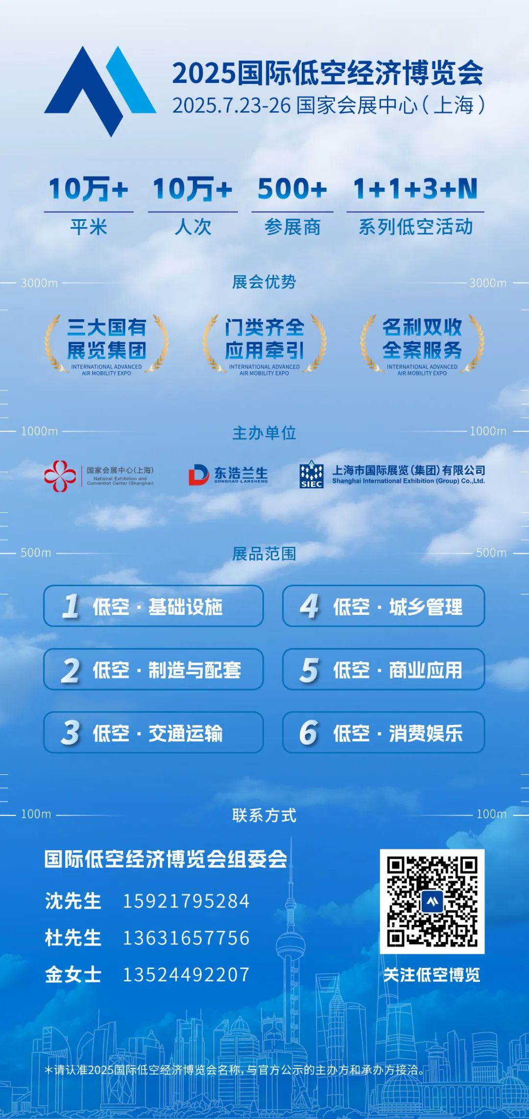 转载 2025-04-21 10:49 低空博览 来源:低空博览由三大国有展览集团联合主办的2025国际低空经济博览会将于7月23-26日在国家会展中心(上海)举行。本次展会获联合国工业发展组织投资和技术促进办公室(中国·北京)支持,共同推动低空经济全球化合作。