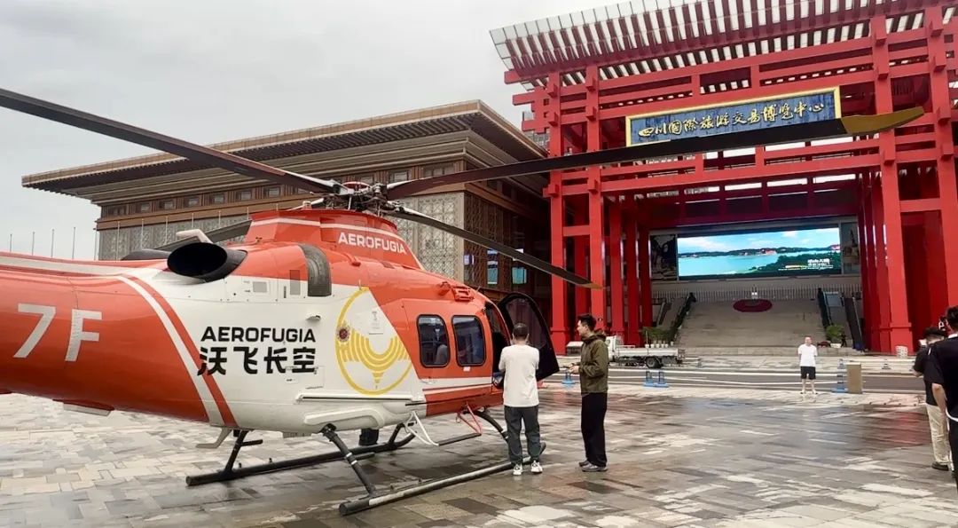 机翼飞旋、引擎轰鸣......21日下午,一架来自四川沃飞长空科技发展有限公司(以下简称“沃飞长空”)的空中游览直升机飞行100多公里从成都抵达乐山,降落在峨眉山市旅博广场,前来助阵即将召开的第十一届四川国际旅游交易博览会(以下简称“旅博会”)。
