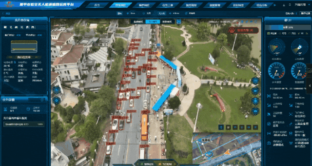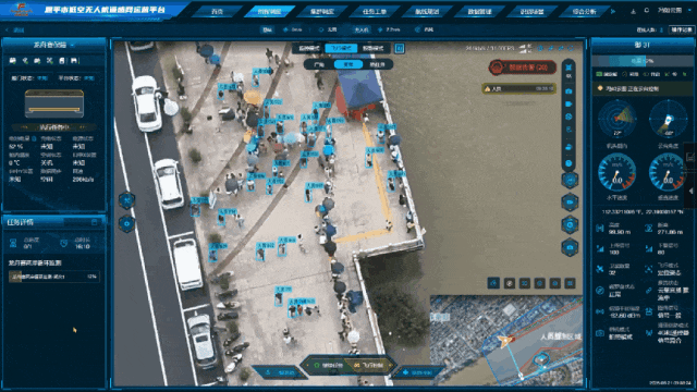 现场工作人员通过“恩平市低空无人机遥感网运营平台”下发任务后,无人机自动起飞,按照在云平台提前预设好的航线,沿河岸线进行低空飞行巡查,并将无人机画面接入现场应急指挥部。无人机进入巡检区域后,自动打开云平台搭载的AI智能识别算法,对区域内的人员、车辆进行分析识别,实时监测潜在风险态势,即时推送告警信息至指挥部,有效保障赛事秩序与安全。