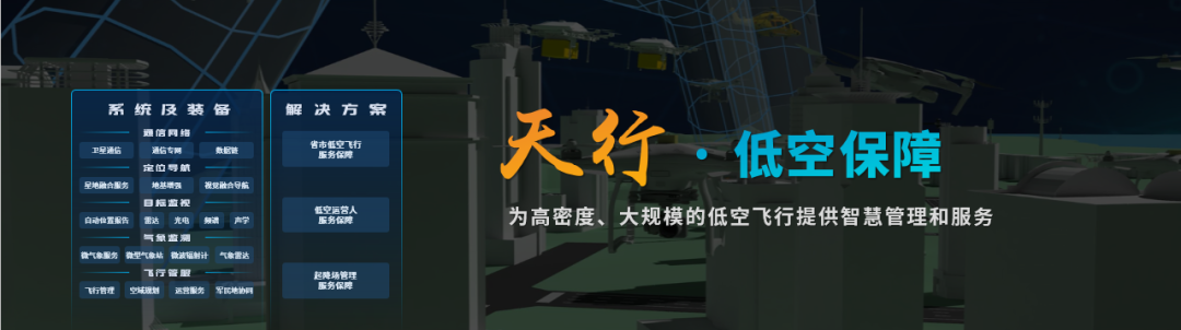 “天行”系列产品为城市空中交通打造空天地一体、通导监融合、军民地协同的低空智能网联基础设施网络及全方位低空管理服务保障体系,面对低空飞行中的态势监控、协同决策、空地通信、资源调度等需求,提供通信网络、定位导航、目标监视、气象服务、飞行管服5大核心能力,推出城市级低空飞行服务保障、低空运营人服务保障和起降场管理服务保障3大解决方案,覆盖卫星通信、地基北斗增强、雷达、气象探测设备、低空飞行管理服务平台等产品,能够为警务、生态、城管等6大类百余个应用场景提供高密度、大规模飞行的完整保障能力,解决空域资源协同、无人机识别、精细化气象预报等问题,确保低空飞行“看得见、叫得到,管得住”。