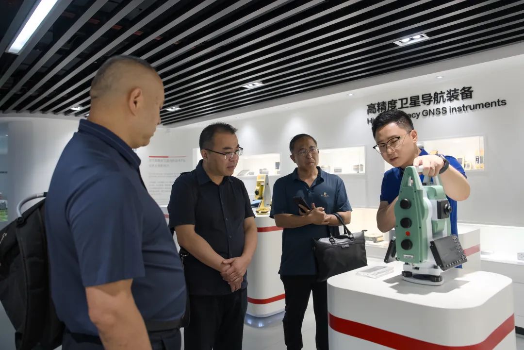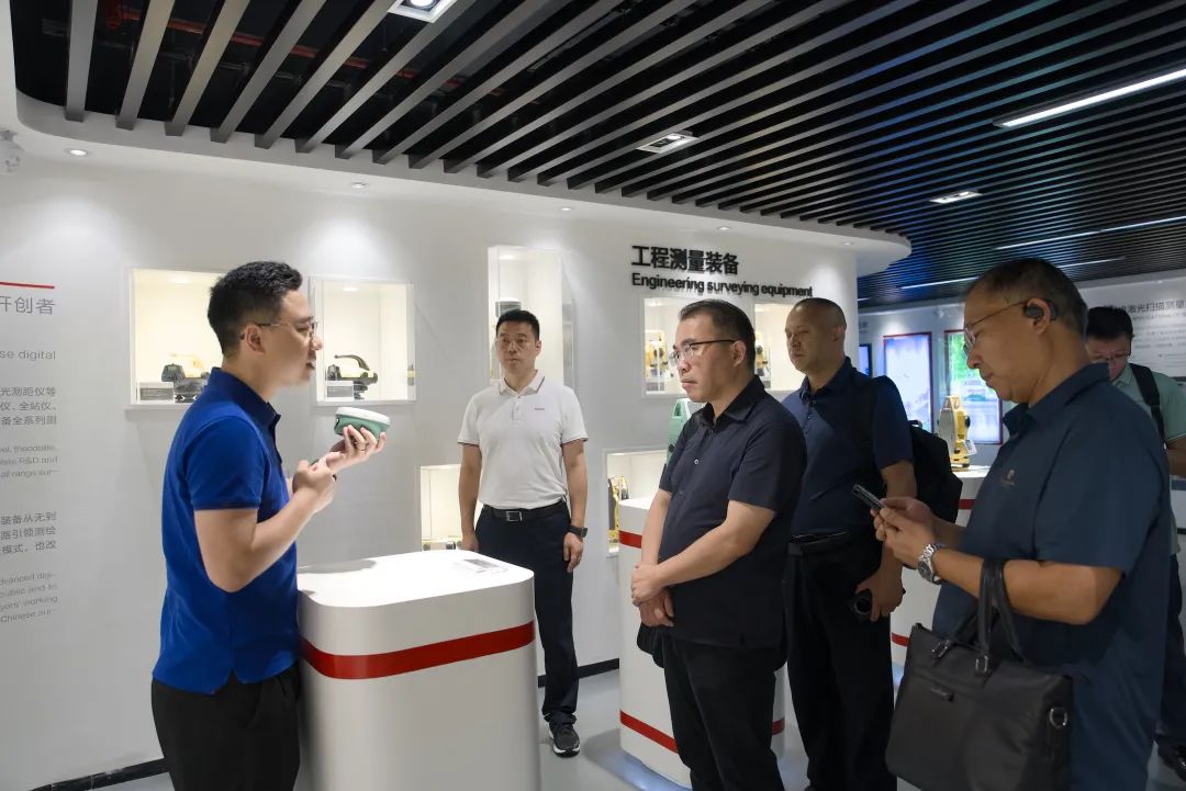李传军一行在测绘产品事业部直销部总监刘自强的带领下参观了南方测绘体验中心,在这里了解了南方测绘的发展历程以及相关技术和行业应用成果。南方测绘业务范围涵盖光电测绘装备、高精度卫星导航定位、激光雷达测量系统、无人机航测、海洋测绘、精密监测及精准位置服务、遥感数据服务、数据工程、GIS平台软件系统及智慧城市应用等。参观期间,李传军一行对全站仪、RTK、管线探测仪等产品颇为关注,就产品研发及其在城市生命线、室内外定位导航、矿山安全监测等场景的应用进行了探讨。