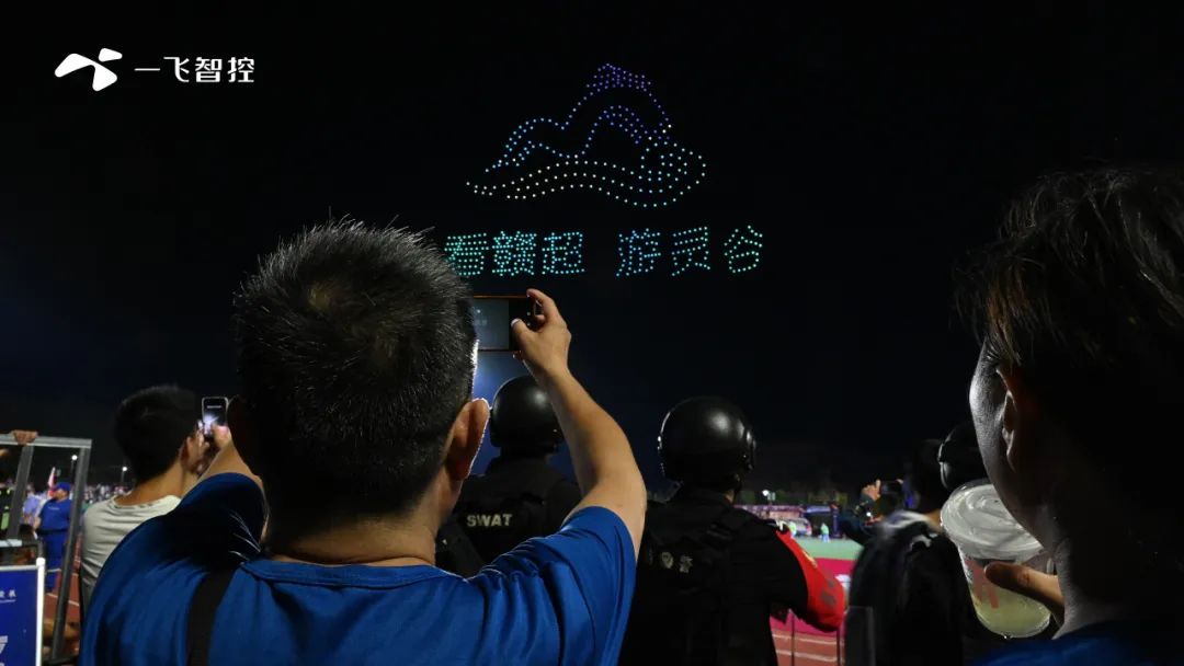 8月3日,江西“赣超”联赛第四轮“抚州VS吉安”在赣东学院体育场火热开赛。作为赛事亮点之一,一飞智控以500架无人机编队表演为比赛注入科技活力,以创新形式为体育竞技加油助威。
