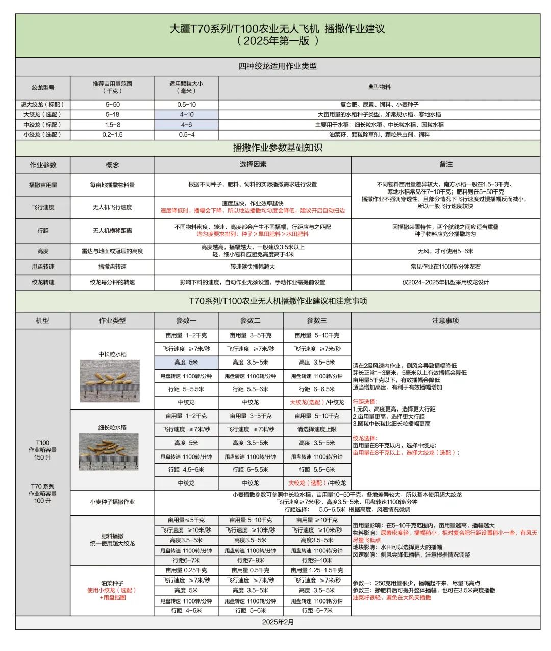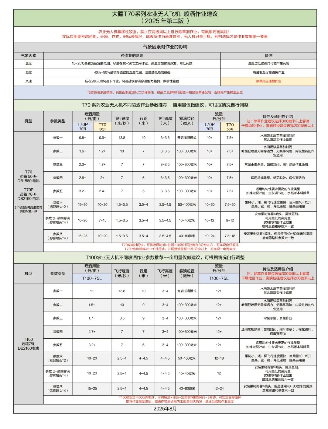 转载 2025-08-11 22:15 大疆农业本作业建议以大疆农业 T70 系列和 T100 农业无人机为基础,结合部分作物、植保知识,最后整合成具有一定范围的作业参数建议,希望能够对各位农业无人机操作者有用。