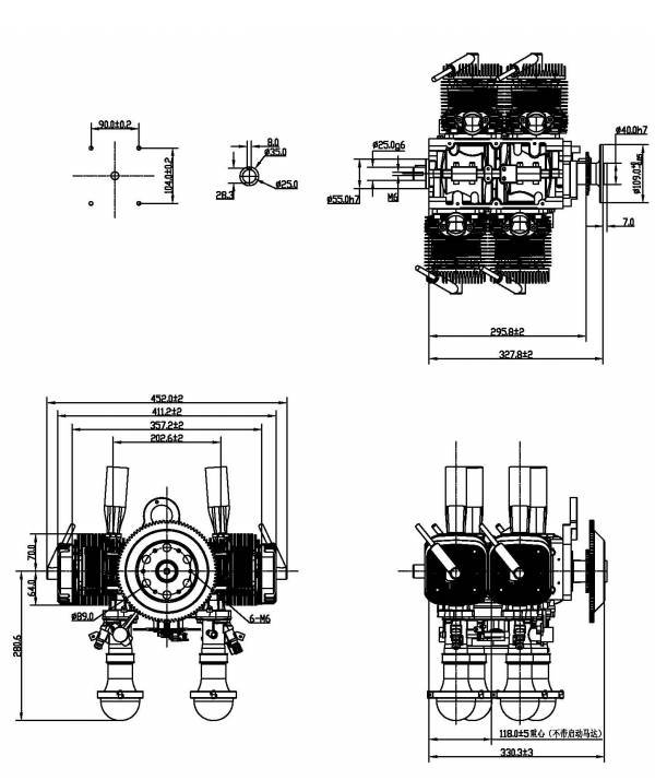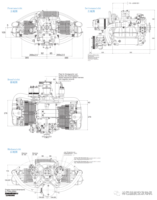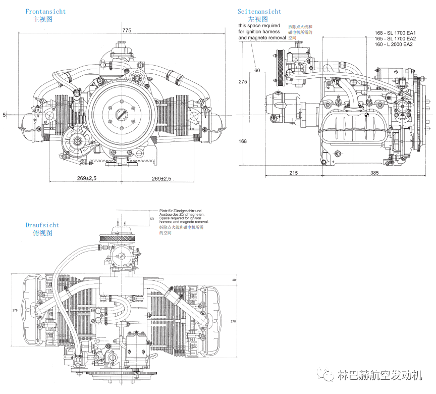 四缸水平对置,风冷,二冲程,固态磁电机点火,混合气润滑,适合推式和拉式安装