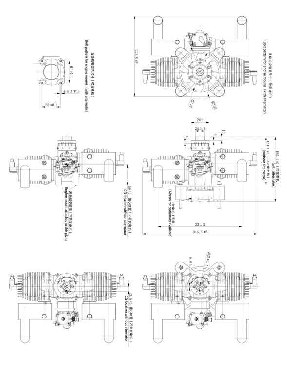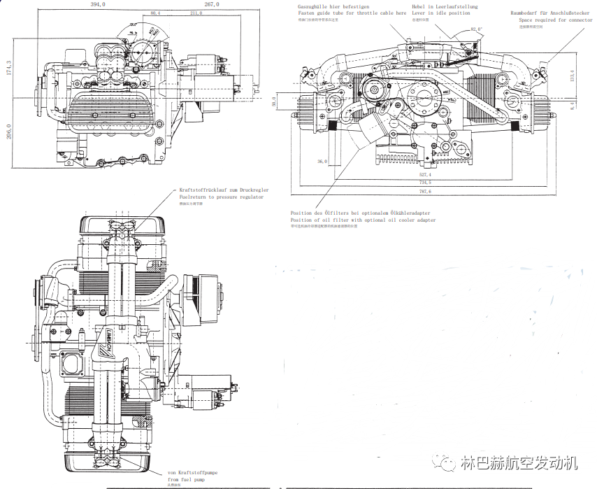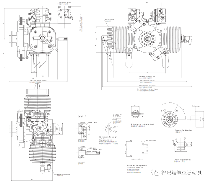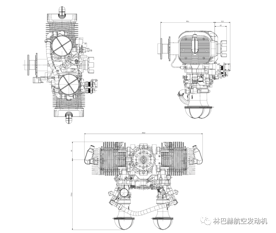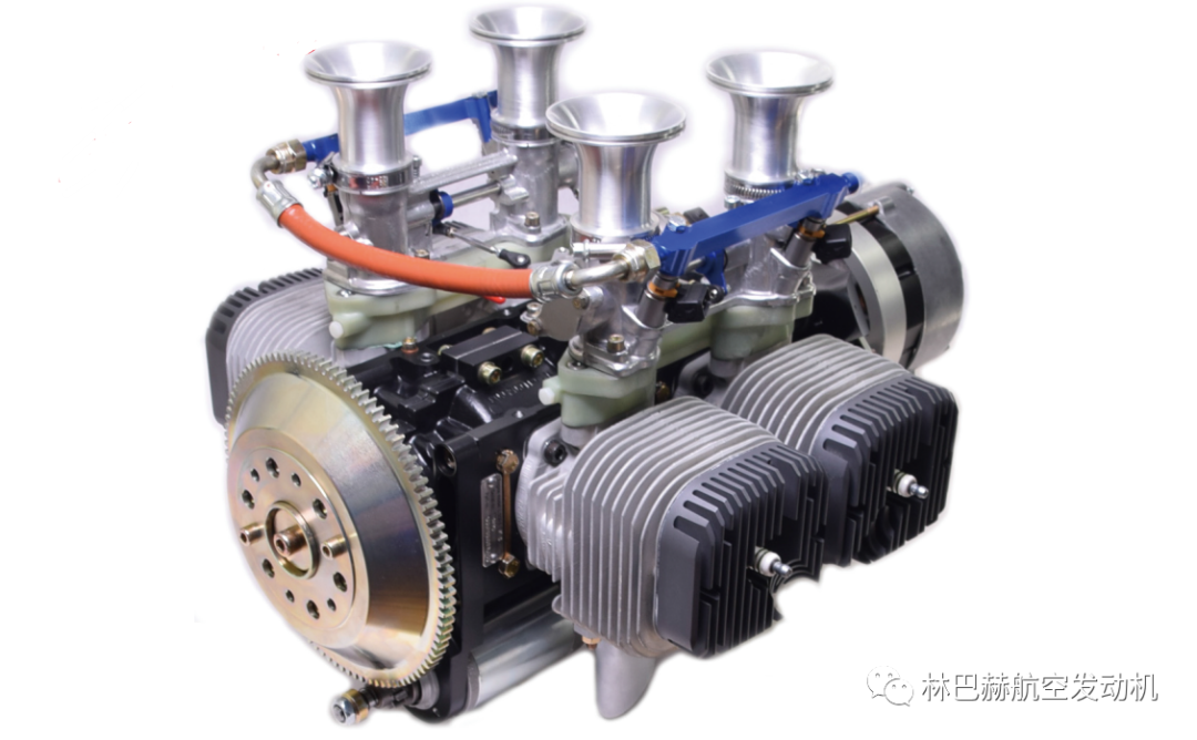 四缸水平对置,风冷,二冲程,固态磁电机点火,混合气润滑,适合推式和拉式装置