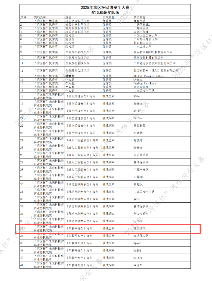 在2025年“湾区杯”网络安全大赛决赛中,容祺智能董事长陈建伟所在的小队——“低空御风”队,凭借扎实的专业技术与卓越的团队协作能力,在《车联网安全》方向的激烈角逐中脱颖而出,荣获“湾区杯·挑战金章”荣誉。