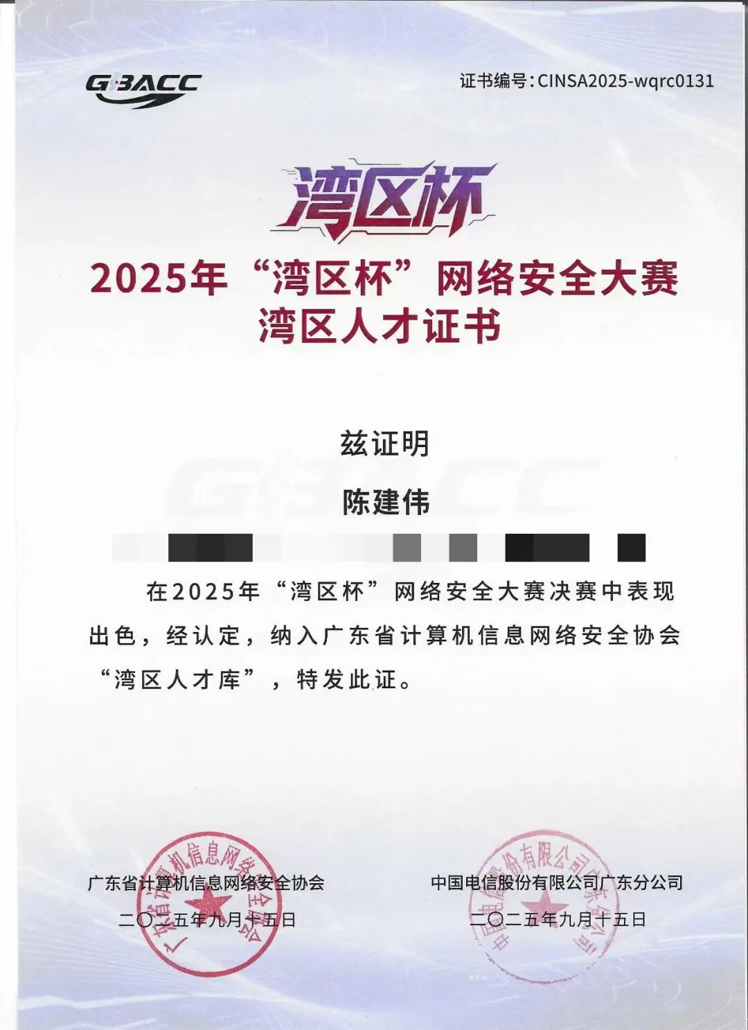 此外,陈建伟董事长在本次比赛中表现优异,经广东省计算机信息网络安全协会认定,纳入“湾区人才库”,并荣获湾区人才证书。这一荣誉不仅体现了他在网络安全与智能科技领域的专业实力,也展现出容祺智能在低空科技与信息安全融合发展上的前瞻布局与创新实力。