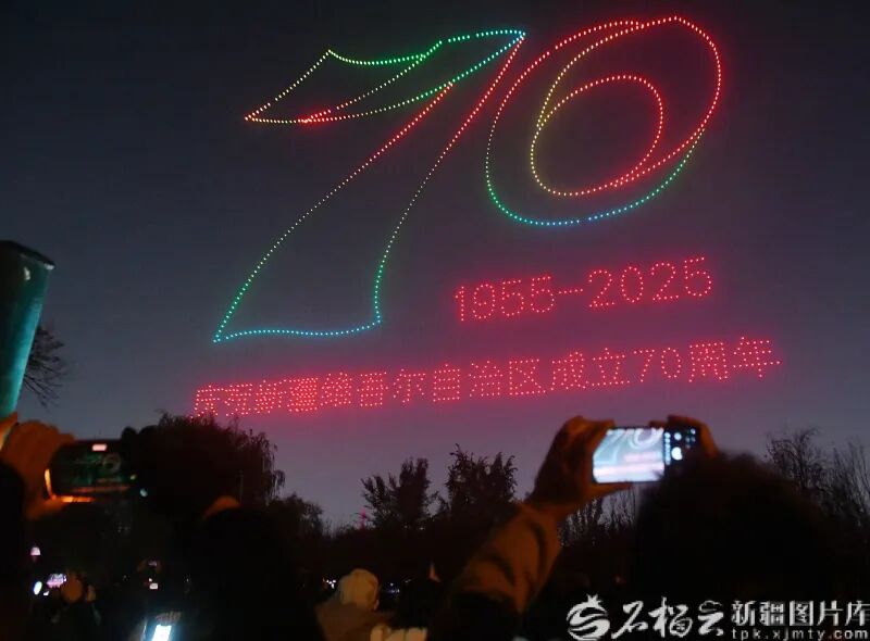 10月25日晚,无人机阵列摆出“庆祝新疆维吾尔自治区成立70周年”字样。石榴云/新疆日报记者 邹懿摄
