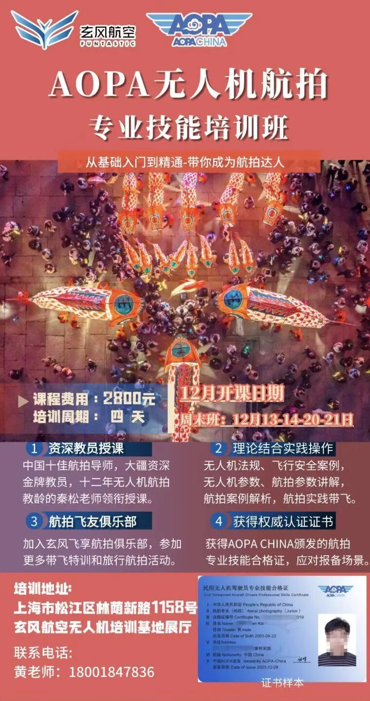 12月份AOPA航拍班将在12月13-14-20-21日进行。