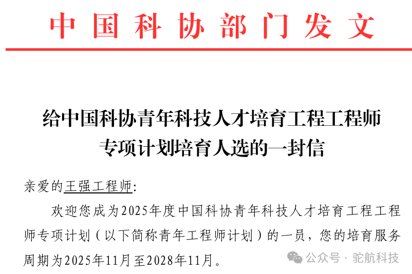 - 驼航科技王强博士成功入选中国科协青年科技人才培育工程-工程师专项计划