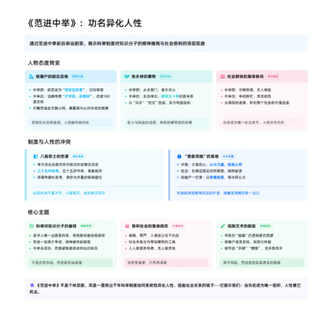 在“教师讲义”的模板下,这份课程按照知识架构结构(科举制度与社会出路,人物关系与社会阶层,主题深化与艺术手法)——关键事实梳理——教学重点提示——待确认信息生成了一份课程大纲。
