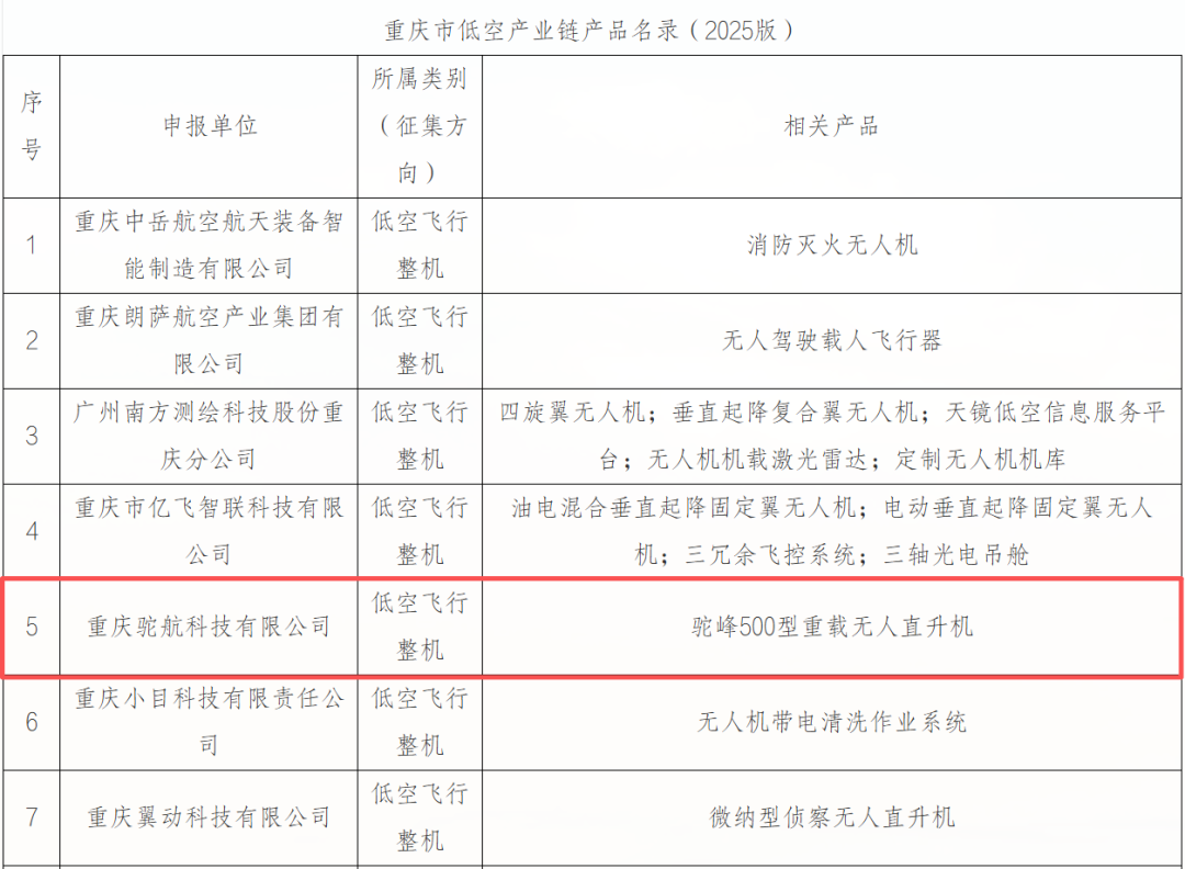 3月23日,市经济信息委、市发展改革委联合发布《重庆市低空产业链产品名录(2025年版)》,覆盖低空飞行整机、部件、能源补给、检验检测、航行保障、安防反制6大类,“驼峰500型重载无人直升机”成功入选低空飞行整机类,展现出驼航科技产品在重庆低空装备领域的技术引领与核心竞争力。