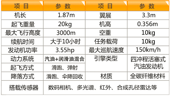 中遥 - 长航时B型无人机,高性能四冲程活塞式汽油发动机使得无人机动力足够,高轻度碳纤维复合材料机身,V型尾翼使得机器重量轻、阻力小,排量小,从而实现了长时间续航,可满足较大面积的地图空白区和特殊地区的测图任务。