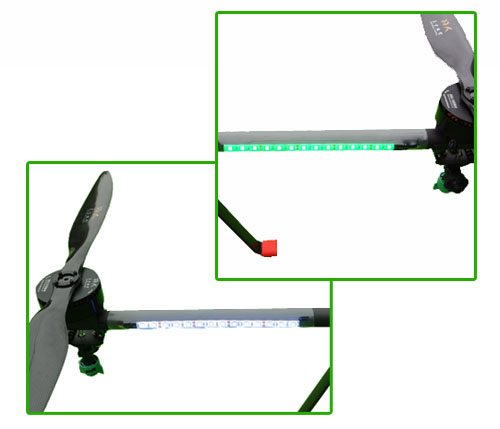 机翼两端安装有高亮LED指示灯带,具有远距离识别和低电量闪烁报警功能。