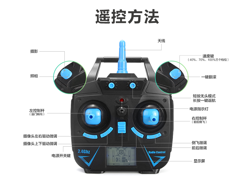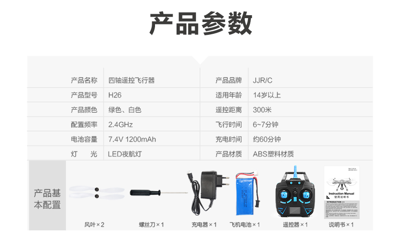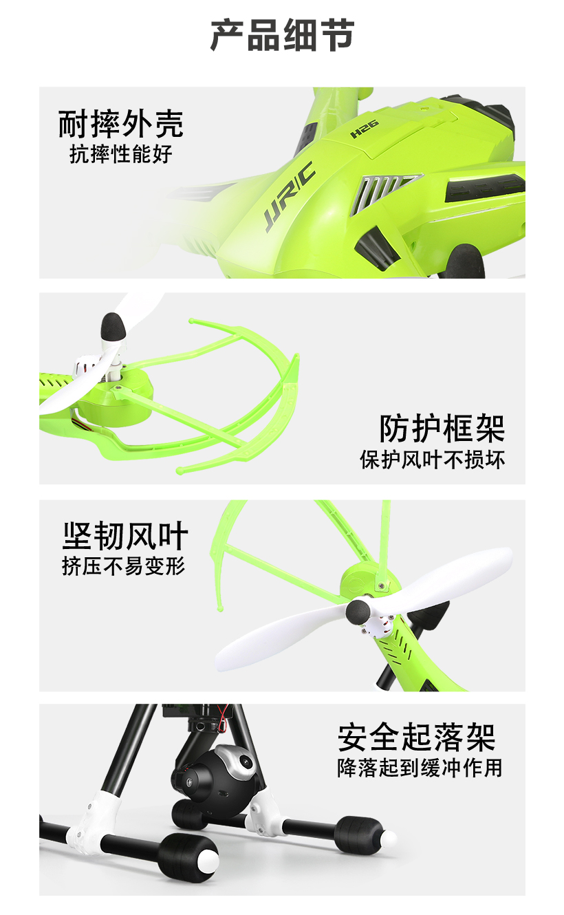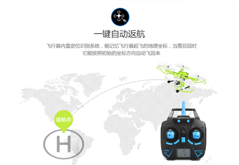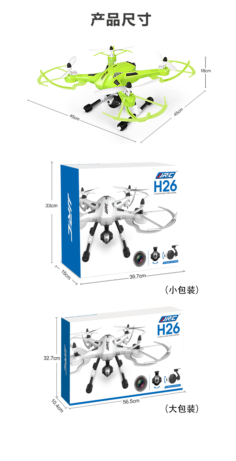 H26可以说具备了你心目中四轴的所有特色:2.4G遥控技术,重力感应功能,特技飞行 技巧,高清航拍,造型设计卓宇不凡,它不仅是敢于翻滚的飞行探险家,还是具有航拍功能的空中记录者。