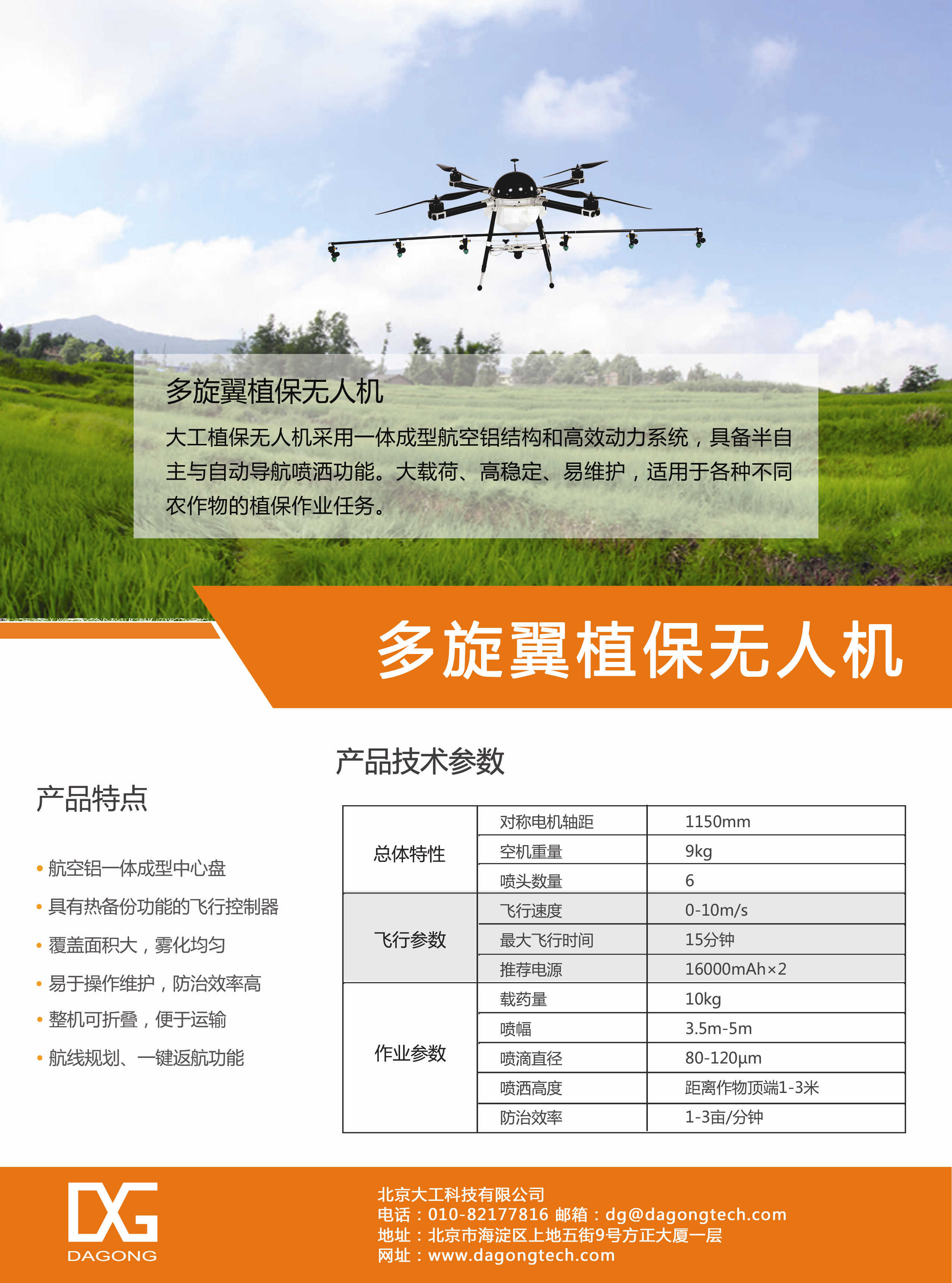 高级航空铝一体成型中心盘,高强度碳纤维双臂结构,载药量10公斤,强劲的动力系统,美国进口压力式喷头。