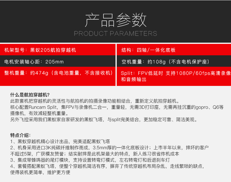 黑蚁205航拍穿越机 到手飞 配runcam split 雨燕摄像头 可录像